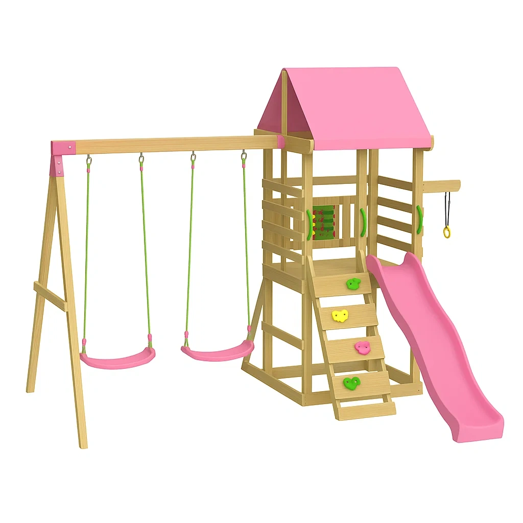 Matériaux: Bois massif, toboggan et balançoires en polypropylène